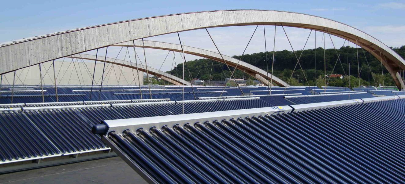 A Wels-i projekt tetőre szerelt CPC vákuumcsöves kollektormezője